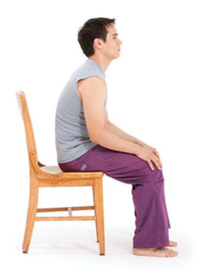 In this well-aligned sitting posture, the head is balanced directly over the shoulder girdle, relieving supporting muscles of the extra burden of holding it up against gravity. Sit tall, with your feet planted firmly on the ground and your sit bones dropping down into the seat of the chair. From this place of grounding, extend the crown of your head up toward the sky, lengthening your spine. Soften your shoulders away from your ears and rest your hands on your thighs. Be sure your chin is parallel to the ground, neither poking up nor tucked in. Imagine that you have a headlight in the center of your chest at your sternum, and shine that light directly forward. Relax your face. With a soft gaze and smiling eyes, look toward the horizon. You might visualize yourself resting your head back against a supportive headrest. If someone looked at you from the side, they’d see your ear directly over your shoulder, and your shoulder directly over your hip.