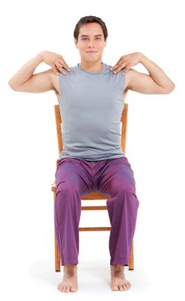 Angel Wings with Circles Geared toward enhancing circulation in the shoulders and upper back, this posture helps free the scapulae, which are suspended by a network of muscles and ligaments that attach to the neck and upper spine. From seated mountain pose, extend your arms forward; then bend your elbows and place your fingertips on your shoulders. On an inhalation, open your elbows out to the sides as you draw your shoulder blades together in the back of your body; imagine that you have a nut on your spine and your shoulder blades are moving together like a nutcracker to squeeze it. On an exhalation, bring your elbows forward and together, as you feel your shoulder blades sliding apart in back of your body. Continue for 3 to 6 breaths. Then, keeping your fingers resting lightly on your shoulders, imagine that your elbows are felt-tipped markers, and draw large ovals in the air with them. Keep the breath slow and easy as you circle in one direction for 3 to 5 breaths and then reverse direction for 3 to 5 more breaths.