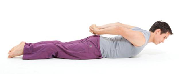 Unlike other variations of bhujangasana, in which the arms can help raise the back, this version requires the back muscles to do all the work. As a result, this pose helps strengthen many of the muscles that tend to be weakened and stretched by forward head position, including the middle and lower trapezius, latissimus dorsi, rhomboids, and serratus posterior. Lying on your belly, bring your arms down by your sides, palms facing down, and your chin or your forehead to the floor (you can place a small folded towel under your forehead if you like). Root down through your pubic bone, and press your legs and the tops of your feet down into the earth, lengthening back through your feet. Find your breath. On an inhalation, lift your head, neck, shoulders, and upper back as high as you comfortably can, keeping the hands on the floor. The goal is to create a slight backbend in the upper spine without stressing the low back. On an exhalation, relax everything back down. Continue with this practice, inhaling up and exhaling down for 3 to 6 breaths. For an extra challenge, stay in the lifted pose for several slow, deep breath cycles. Be sure to keep your neck long so that you’re not just cranking your neck up and down but using your back muscles to lift the back and shoulders; imagine that you have an eye in the back of your neck, and try to keep that imaginary eye wide open. Arm Variation: Clasp your hands behind your back, keeping the elbows soft. On an inhalation—as you lift your back, shoulders, and head—also lift your clasped hands up away from the tailbone and extend your arms back. Allow this action to help draw the shoulders back, and invite the arms to straighten without locking the elbows.